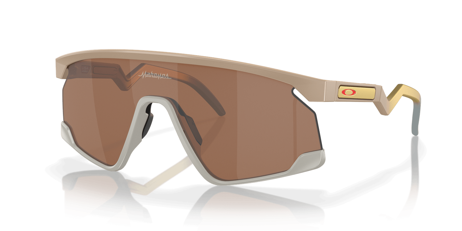 The Oakley BXTR Patrick Mahomes II Collection is a new generation of shield sunglasses designed with the athlete in mind. These unisex shades feature an o matter frame construction and matte terrain tan color paired with prizm tungsten lens technology for optimal vision and clarity. Elevate your game to the next level with these cutting-edge frames, where performance meets style. Available with lens contrast enhancement technology.